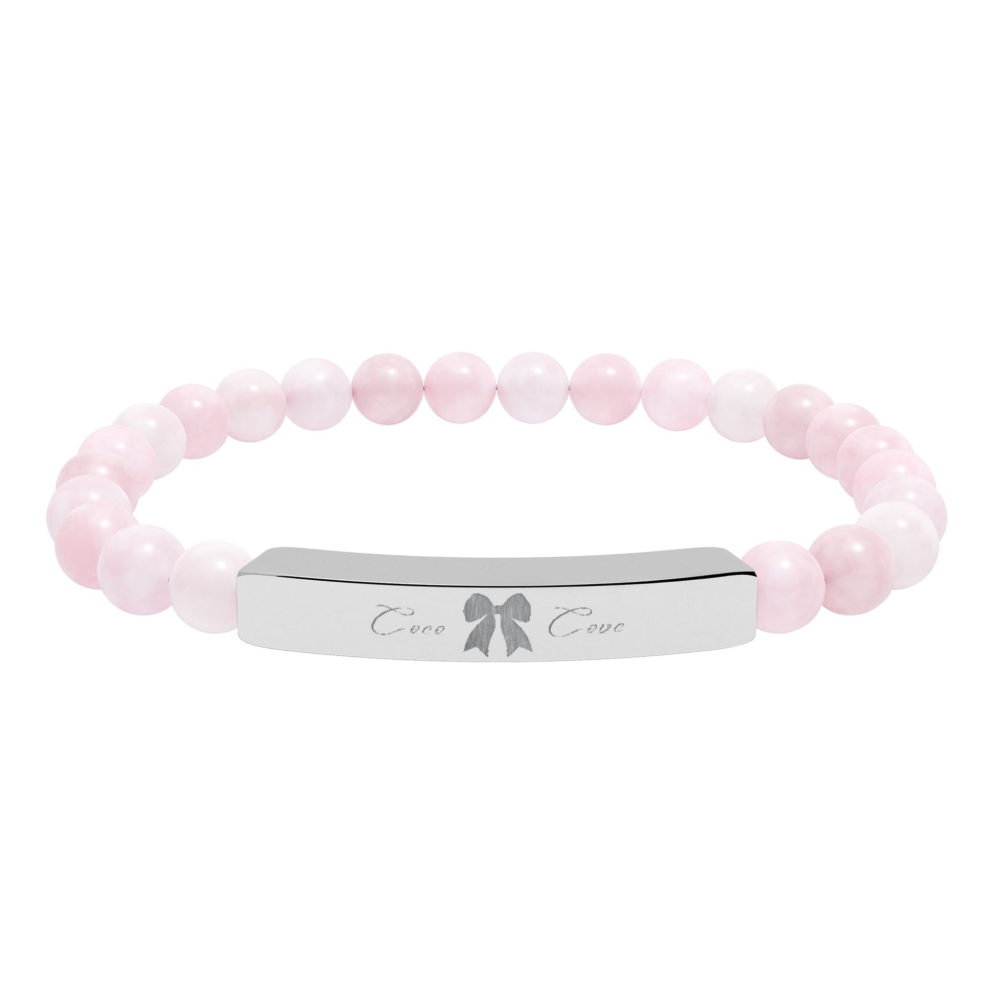 A calm, thoughtfully designed stretch bracelet that pairs natural stone beads with a sleek engraved stainless steel bar. The soft, muted tones of the stones bring an organic, grounding presence, while the polished 316L stainless steel bar carries a subtle, permanent engraving for a refined contrast. Lightweight and comfortable on the wrist, it slips on easily and layers naturally with other pieces or stands alone as a quiet statement. Comes protected in a white gloss jewelry box with non-tarnish cotton fiber, ready for wearing or gifting.